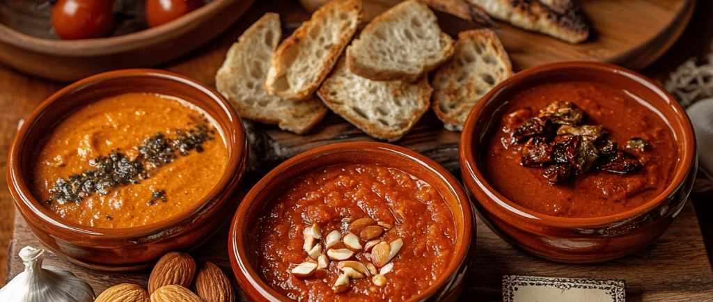 Sabor y textura: El romesco es equilibrado en dulzor, acidez y especias; el xató es más ácido por su mayor contenido de vinagre; y la salvitxada es más ligera y suave.
